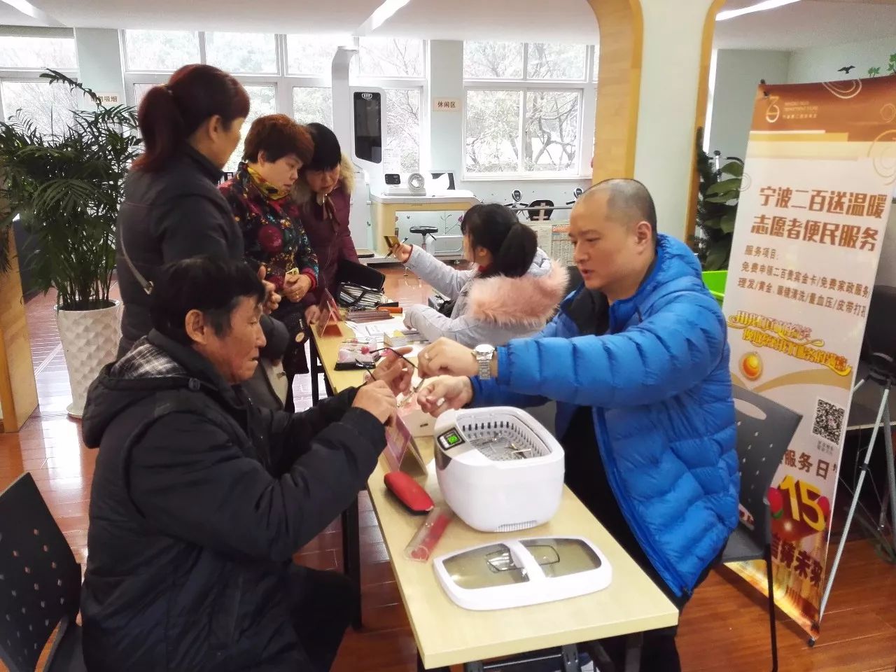 12月28日,一個陰雨綿綿的日子,冷空氣的到來,使甬城染上了絲絲涼意。這樣的日子里,寧波二百志愿者團隊一大早便驅(qū)車趕往位于鐘公廟街道的鐘盈小區(qū)進行便民服務。盡管天氣欠佳,但志愿者的熱情確絲毫未曾懈怠,到了小區(qū)服務點之后??粗蝗喝呵皝淼睦夏昃用瘢僦驹刚邆冮_啟了忙碌的“行程”。此次二百提供的便民項目主要有:黃金眼鏡清洗、皮帶打孔、血壓測量、義務理發(fā)以及貴賓卡免費申領。